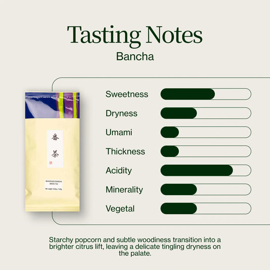 De smaak van bancha groene thee is wat milder en aardser dan die van jongere varianten. Je proeft mogelijk tonen van hout, graan en zelfs citrus. De houtachtige tonen komen van de oudere, dikkere stengels van banchathee, die zelfs een klein beetje schors hebben.