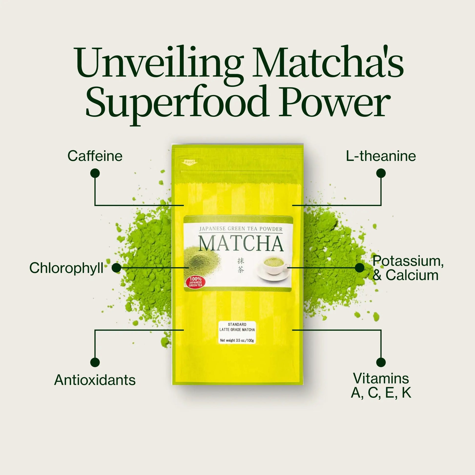 Dit pakje bevat 100 gram theepoeder, genoeg voor 50 Matcha Lattes