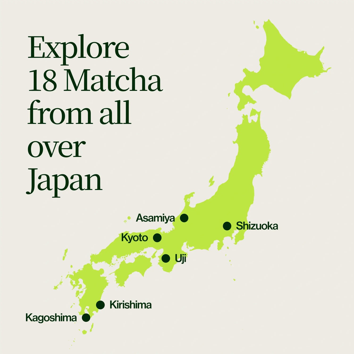 Our matcha is harvested across six celebrated Japanese tea areas, Miyazaki, Kyoto, Uji, Shizuoka, Kagoshima, and Kirishima. Grown by nine devoted small-family farms, each batch delivers the fresh, genuine taste of Japan right to your cup.