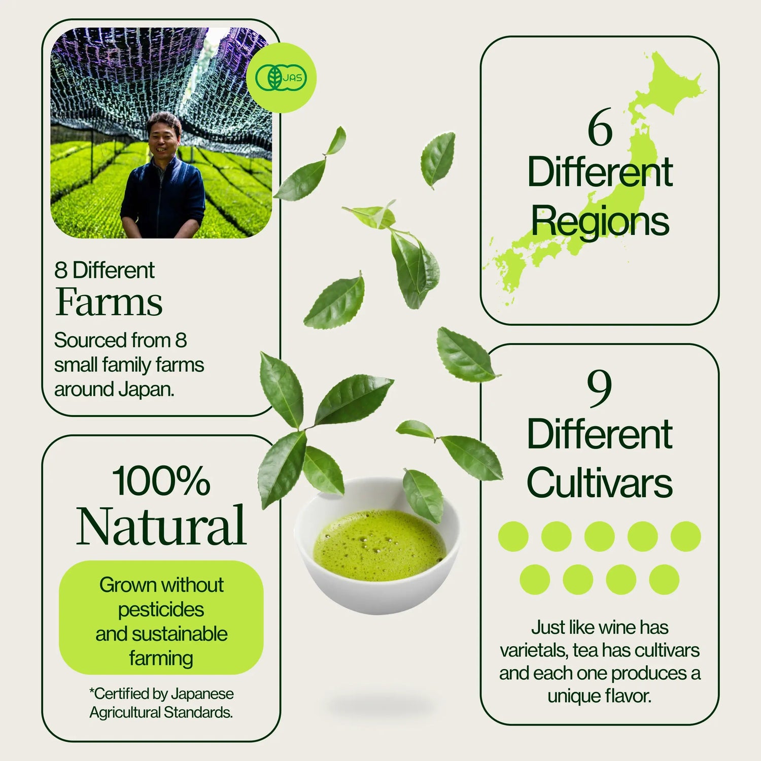 From the bright lift of Yabukita to the savory depth of Gokou and the velvety smoothness of Okumidori, this sampler showcases Japan’s most celebrated matcha cultivars. Compare each cup, note your favorites, and discover the cultivar-region combo that speaks to your palate. Our team spent years visiting farms nationwide, evaluating countless harvests; the finest of those tastings now appear together in this curated set.