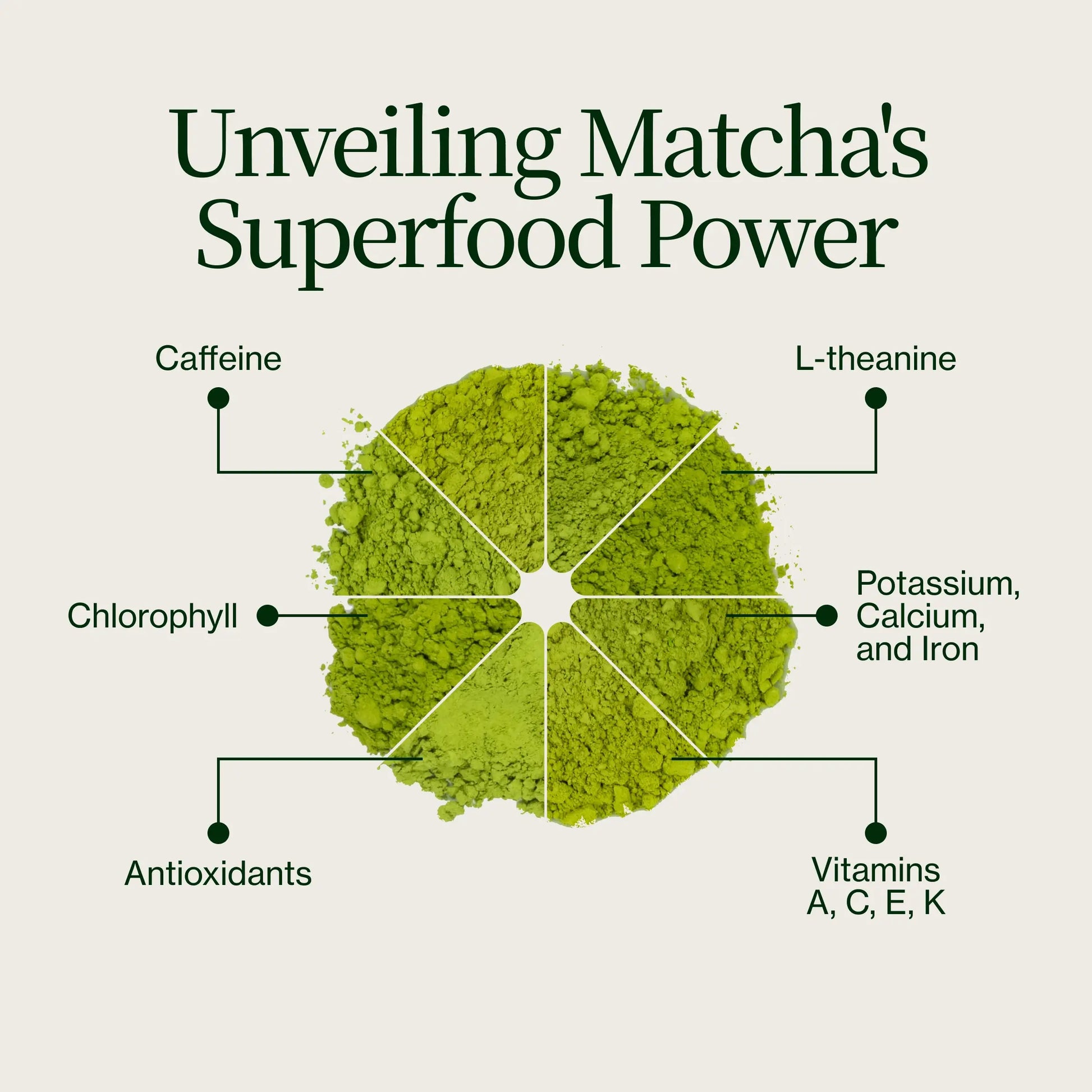 Matcha zit boordevol krachtige antioxidanten, natuurlijke cafeïne en kalmerende aminozuren die zorgen voor langdurige energie, mentale helderheid en een gevoel van kalme focus. Het ondersteunt het algehele welzijn, stimuleert de stofwisseling en bevordert een gezond immuunsysteem, waardoor het de perfecte aanvulling is op je dagelijkse routine of feestritueel.