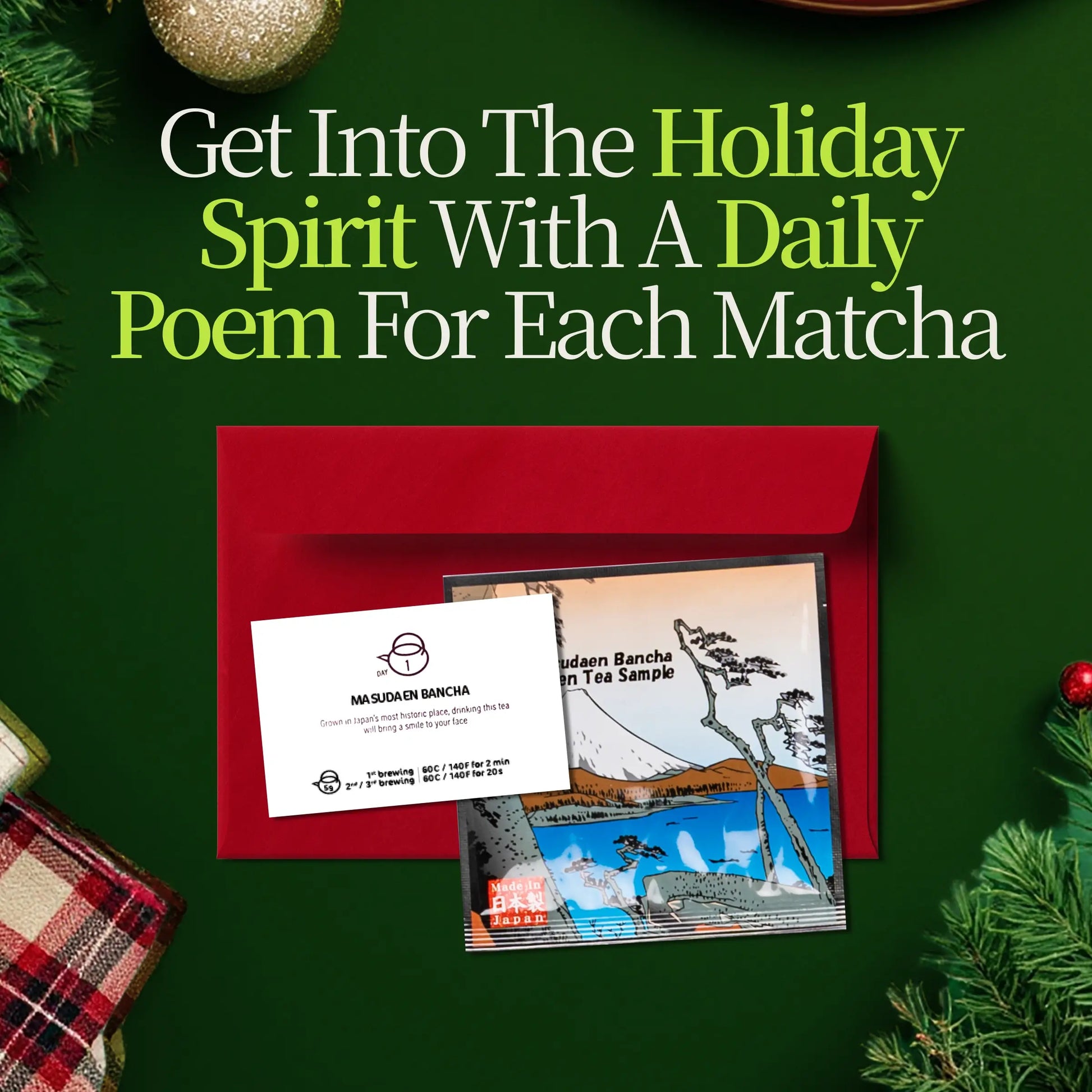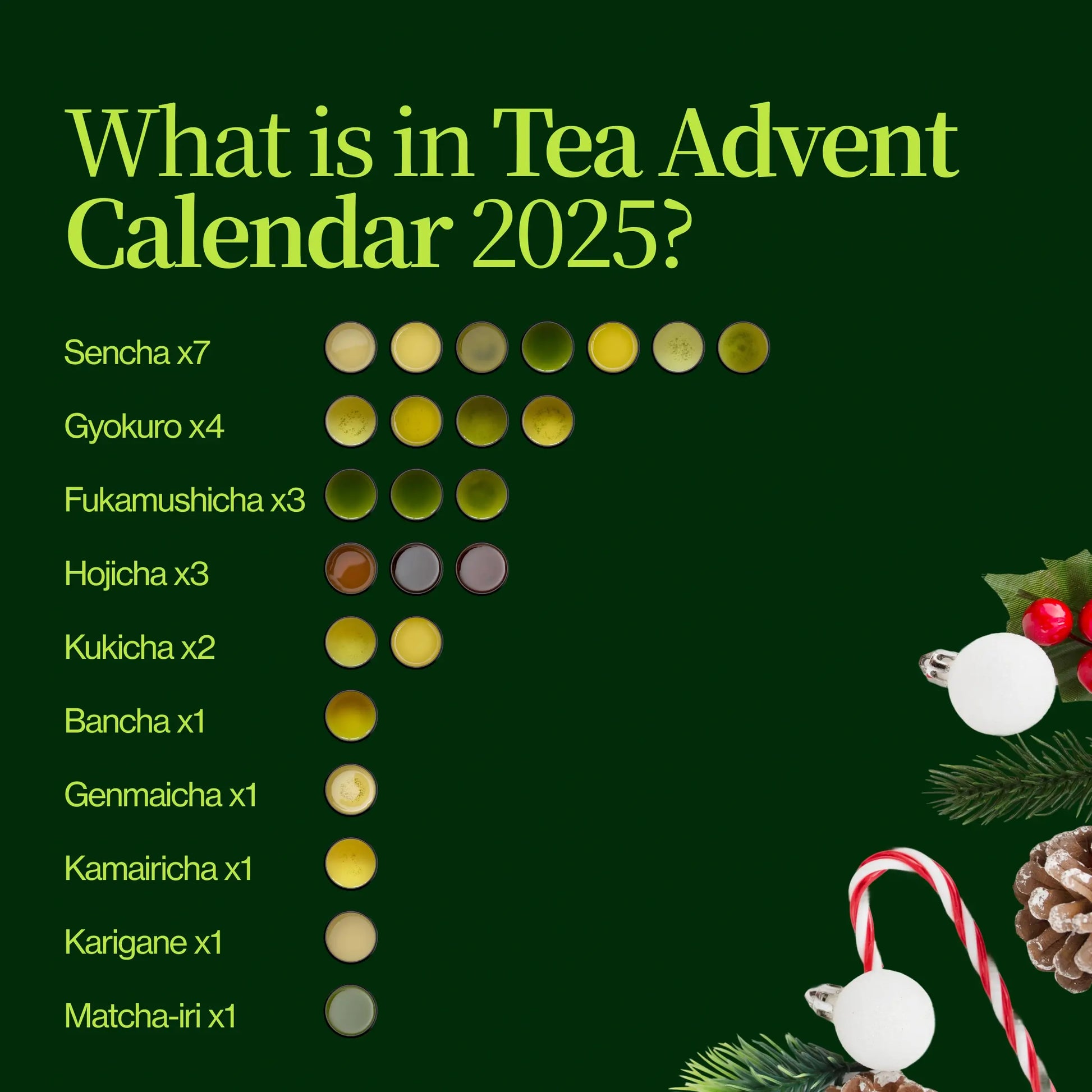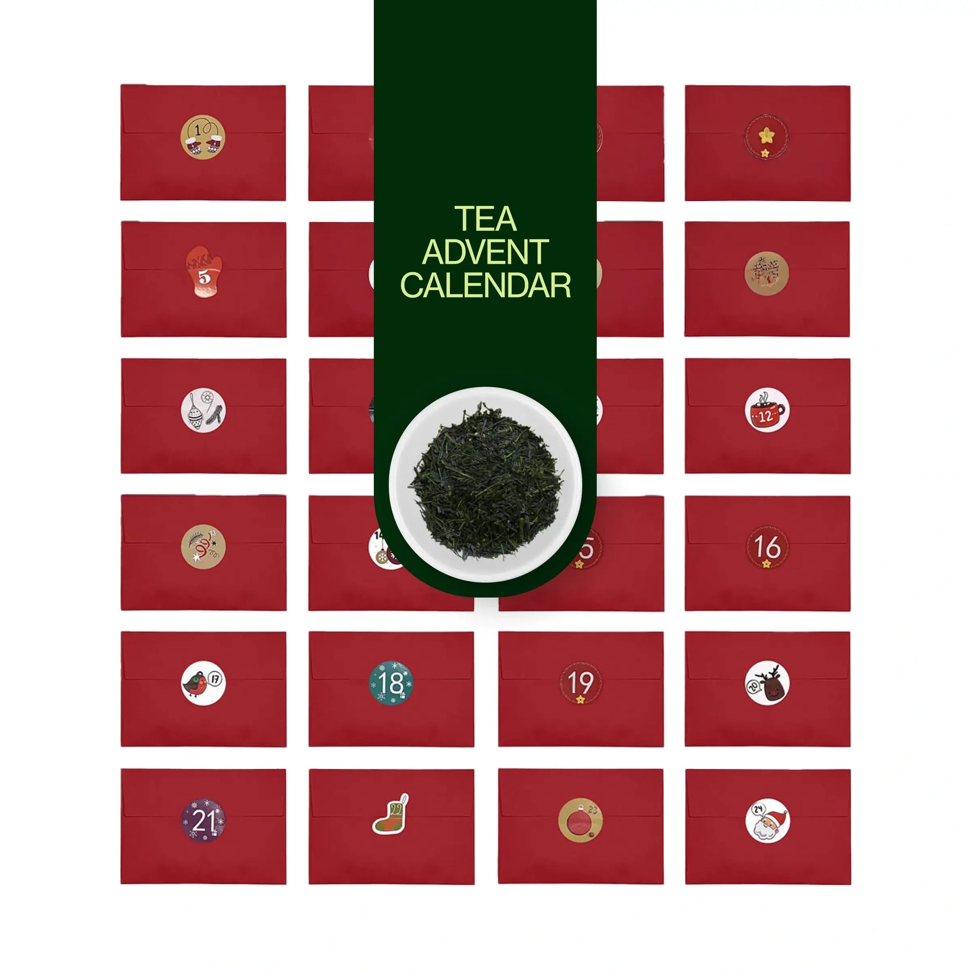 Deze losse thee-adventskalender bevat een reeks van de meest iconische groene theeën van Japan, van verfrissende Sencha tot rijk Gyokuro , geroosterd Hojicha , en meer. Ontdek unieke theesoorten zoals fukamushi Sencha , kukicha, bancha, Genmaicha , Kamairicha , karigane en matcha-iri om de verschillende smaken te ervaren die Japan te bieden heeft.