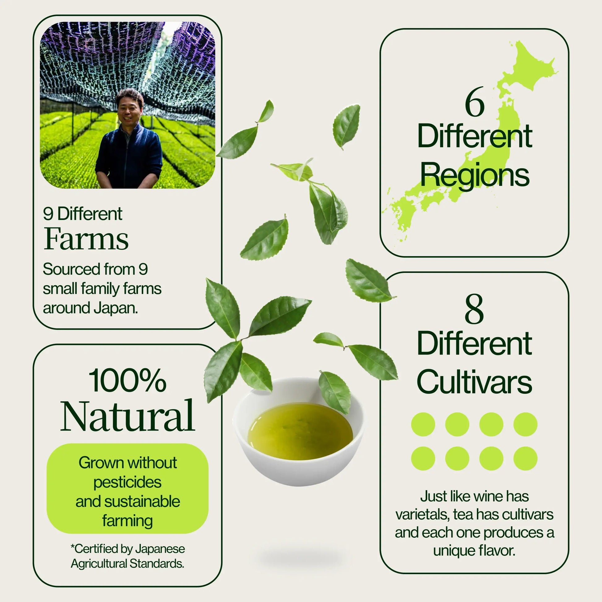 Onze thee komt uit zes beroemde theeproducerende regio's in Japan: Miyazaki, Kyoto, Uji, Shizuoka, Kagoshima en Kirishima. Elke thee is een bewijs van de vaardigheid en toewijding van negen kleine familiebedrijven, die u verse, authentieke smaken rechtstreeks uit Japan bieden.